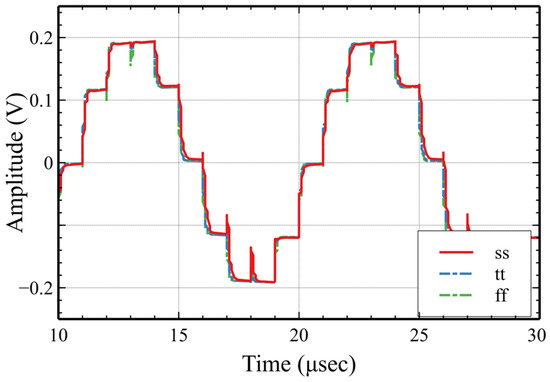 The amplifier was designed for an amplification factor G = Cin/Cf = 4, where Cin = 4 pF and Cf = 1 pF. Figure 9 and Figure 10 show the transient response of conventional low-voltage SC amplifier using a class A Miller op-amp and conventional low-voltage SC amplifier using the enhanced class AB single output Miller op-amp respectively. Figure 11 shows the transient simulation of the proposed low-voltage SC amplifier. For all of these circuits similar input signals a 100 mVpp 100 kHz sinusoidal input, a 1 MHz clock and with an op-amp offset voltage Vos = 30 mV were used. Clock voltage boosting by a factor of two was used [26] to allow switches to operate with rail-to-rail signals and a low supply voltage. The slew rate requirement was highly relaxed as compared to the transient response of the conventional low voltage SC amplifier that uses a class A Miller op-amp; this is depicted in Figure 9. Figure 10 shows the output of the conventional SC amplifier utilizing the proposed GB SR-enhanced AB/AB op-amp with no auxiliary output. The slew rate is improved, but significant distortion is present due to the large slew rate required by the low-voltage operation of the circuit. Simulations of the proposed technique using the enhanced multiple-output Miller op-amp are shown in Figure 11. It can be seen that the output is a true sample and hold signal with no reset to zero or to another constant voltage. The multiple-output technique reduces the slew rate requirements imposed on the op-amp by low-voltage SC circuits. Moreover, it also cancels the 30 mV op-amp input offset voltage. The outputs of the conventional and proposed amplifier are compared in Figure 12, Figure 13, Figure 14 and Figure 15, showing the PVT simulations of the circuit. The design is robust to ss, tt and ff process variations, as well as to 0 °C, 25 °C and 85 °C temperature corners and to supply voltage variations up to 10%.