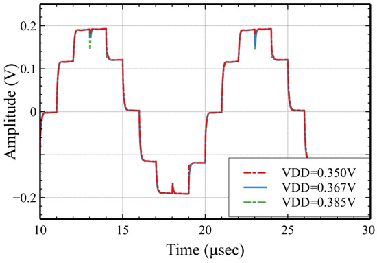 In [17,18,19], schemes for the low-voltage operation of SC circuits were reported. The scheme reported in [17] consists simply of DC shifting the input gates of the op-amp from the conventional mid-supply voltage to a value VSSP or VDDP that is close to the lower or upper supply rails, VSS or VDD, for op-amps with a PMOS or NMOS input differential pair, respectively. This simple low-voltage technique (LVT) can be easily implemented, as illustrated in Figure 1b where an op-amp with an NMOS input differential pair is assumed. Here, low supply operation is possible, since both terminals of the op-amp operate at a reference voltage VDDP that is close to VDD. But this value is canceled out, along with the offset Vos in the signal path, since it is treated as an additional offset term. Unfortunately, this simple low-voltage implementation scheme worsens the SR limitation of the op-amp in SC circuits, since the output reset value is now close to one of the rails instead of to the mid-supply voltage, and the worst-case swing is increased by close to a factor of two. This is depicted in Figure 3 for the case of the SC amplifier of Figure 1 with a nominal gain G = 4 V/V that operates with ±0.35 V supplies in 180 nm CMOS technology that has nominal supplies of ±0.9 V. When the positive input terminal of the op-amp is connected to a voltage VDDP = 0.27 V, the output resets also to VDDP + Vos during phase ϕ, and for the peak negative portion of the signal the required SR is almost doubled, since now a swing close to the supply is required during the reset phase ϕ. The multiple-output op-amp technique addressed above can be used to essentially alleviate this problem in low-voltage SC circuits based on the technique proposed here.