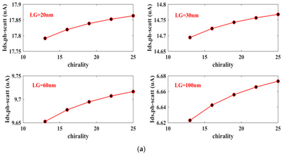 As observed in Figure 5 and Figure 6, there is a significant reduction in both the total current and transconductance, which is attributed to the electron–phonon scattering effect. This decrease amounts to approximately 78.6% for both the total current and transconductance. Figure 7a illustrates the simulation of the current estimated under the influence of electron–phonon scattering for various chiralities of nanotubes ranging from (13, 0) to (25, 0), (), subject to different CNTFET channel lengths between 20 and 100 nm. Additionally, Figure 7b displays as a function of temperature, with varying , across a range of 200 K to 500 K. As can be observed, increases with increasing nanotube chirality. However, at higher temperatures, it decreases.