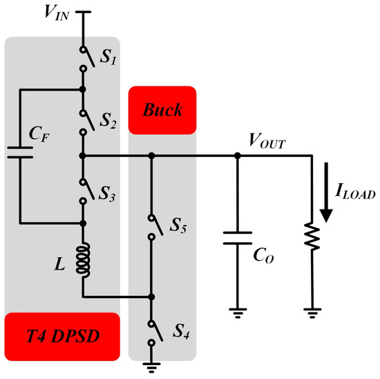 In 2020, Katsuhiro Hata proposed the type 3 DPSD topology, in which the maximum voltage stress on the switches is limited to VIN–VOUT. This effectively reduces the voltage stress. However, its step-down conversion ratio range is limited to 0 to 0.5 [12]. In 2021, Professor Shaowei Zhen from the University of Electronic Science and Technology of China proposed a DC-DC converter based on the type 4 DPSD topology [13]. Although the maximum voltage stress of the switch was reduced to VIN–VOUT, the range of the step-down voltage conversion ratios (VCRs) was only 0–0.5. In 2022, Guigang Cai from the University of Macau proposed the parallel inductor buck, called SC-parallel-inductor hybrid buck (CPL-Buck) [14]. Although this structure reduces the voltage stress on the switch tube, it employs six switches, has a relatively complex structure, and cannot achieve a step-down conversion ratio range from 0 to 1. To overcome the above limitations, we propose a new topological structure, called dual-path step-down topology with auxiliary switches. The proposed topological structure aims to effectively reduce the voltage stress of the switch while maintaining the same step-down conversion range as the Buck circuit, thereby improving the overall performance of the power management chip. Due to the effect of the flying capacitor and auxiliary switches, this topology enables a rational distribution of the voltage stress across the switching devices during operation, thereby preventing the occurrence of excessive voltage stress.
