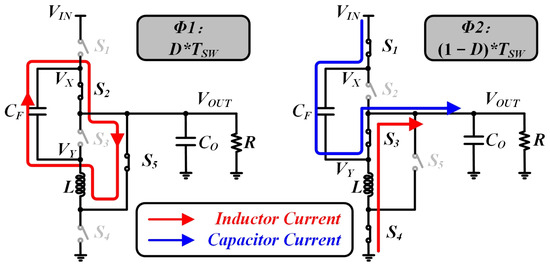 Figure 3 provides a comprehensive illustration of the operating principle of the proposed topology. Specifically, during the Φ1 phase, S2 and S5 are switched on while S1, S3, and S4 are in the off state. As a result, a series connection is established between CF and L. At this point, CF charges the inductor. The situation changes when the operation reaches Φ2, where S1, S3, and S4 are on and S2 and S5 are off. At this point, CF is charged to the VIN–VOUT voltage level. At the same time, L discharges to the load.