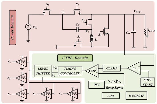 In the power stage, the power switches S2 and S5 are turned ON, while S1, S3, and S4 are turned OFF during Φ1; during Φ2, S1, S3, and S4 are turned ON, while S2 and S5 are turned OFF. The voltage at VY can fall below the ground level during Φ1 due to the discharge of CF. During Φ2, VX reaches VIN because S1 closes. To minimize the number of off-chip components and simplify the circuit, S3 and S1 are implemented using PMOS transistors. The remaining switches are implemented with NMOS transistors.