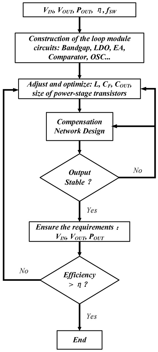 Therefore, to meet the performance requirements and ensure the functioning of the converter, Figure 5 presents the design flowchart of the proposed converter. The converter design begins with defining key specifications before proceeding to implement the control loop modules including bandgap reference, LDO regulator, error amplifier (EA), and oscillator (OSC). Subsequently, the power stage circuitry is constructed with optimized passive components and properly sized power switches, followed by critical loop compensation tuning. The design is finalized only after rigorous verification confirms all input/output characteristics and efficiency metrics meet target requirements, completing the comprehensive power converter development process.