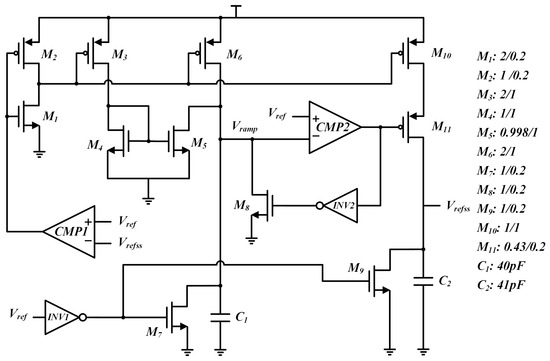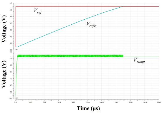 At first, the output voltage (Vrefss) is set at zero because there is no charge on the C2. Vrefss is lower than the reference voltage (Vref), making M1 on so that the current mirrors M3–6, and M10 start to work.