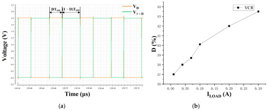 Figure 10a shows the simulation results of the time control signal when VIN = 3.3 V and ILOAD = 100 mA. Figure 10b represents the simulation results of the relationship between the duty cycle D of the converter and ILOAD under the condition VIN = 3.3 V. According to Figure 10b, when ILOAD is small, the actual value of the D is approximately the same as the theoretically calculated value of VOUT/VIN (36.4%). However, as ILOAD increases, the D of the converter will gradually be larger than its theoretically calculated value. As the load current increases, the inductor requires more energy to maintain the output. Therefore, in order to ensure that the output remains constant, the time for CF to charge the inductor needs to be extended, that is, D needs to increase. The voltage across CF will gradually decrease during the inductor charging phase. This situation is not obvious when the load is light, but when the load is heavy, this phenomenon will be magnified, thus further increasing the charging gain time of the inductor current. Therefore, D will increase as ILOAD increases. According to Figure 10b, when the load current is less than 0.1 A, the duty cycle can be approximately regarded as being unaffected by the load current.