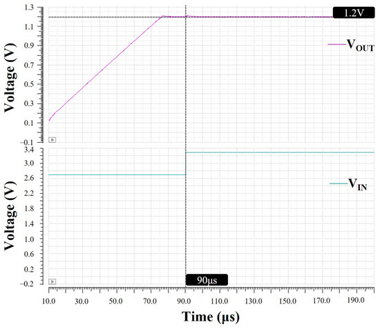 To detect the robustness of the converter, the waveform of the converter’s output voltage when the input voltage undergoes an instantaneous change is shown in Figure 11. At Time = 90 µs, VIN changes from 2.7 V to 3.3 V. At this time, the VOUT will experience a brief spike fluctuation, with the peak voltage reaching 1.215 V. After this short-term fluctuation, the output voltage continues to be stably output.