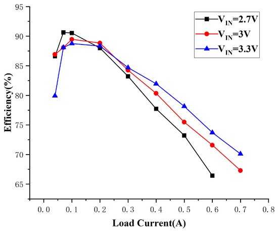 Figure 12 presents the simulated efficiency versus load current characteristics of the converter under different input voltages. The converter achieves a peak efficiency of 90.6% at VIN = 2.7 V and ILOAD = 70 mA. Under higher step-down ratios with VIN = 3 V and VIN = 3.3 V, the peak efficiency remains above 88%.