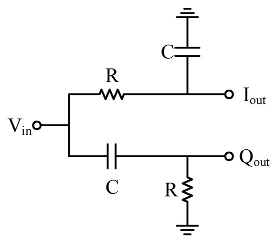 The quadrature signal generation circuit in this paper employs an RC-CR frequency-selective network. The traditional quadrature signal generator based on an RC-CR network is shown in Figure 2. This circuit consists of an RC low-pass filter and a CR high-pass filter, which produces output signals Iout and Qout with a 90° phase difference. When the angular frequency ω = 1/RC, the magnitudes of the output signals Iout and Qout are equal. However, as the signal bandwidth increases, the orthogonality of the output signals degrades. Therefore, a single-stage RC-CR quadrature signal generator is typically used in narrowband systems [20].