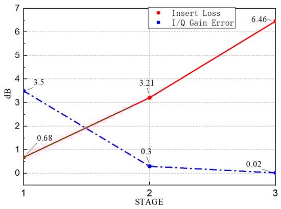 To expand the bandwidth, this paper adopts a cascaded configuration of the single-stage RC-CR network. By introducing multiple poles, this approach extends the bandwidth while making the structure less sensitive to the load capacitance at the output. The more stages added to the RC-CR network, the wider the covered bandwidth becomes, but at the cost of increased insertion loss [21]. Figure 3 shows the insertion loss and amplitude error of the RC-CR network vary with the number of its stages. Figure 4 shows the simulation results of phase error and amplitude error. Considering the design requirements for bandwidth, insertion loss, and phase shifting error, a two-stage cascaded polyphase filter structure was ultimately selected.