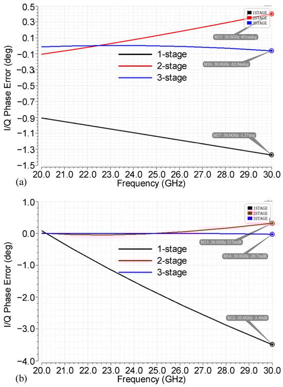 (a) Phase error and (b) amplitude error for 1-/2-/3-stage PPF from 20 to 30 GHz.