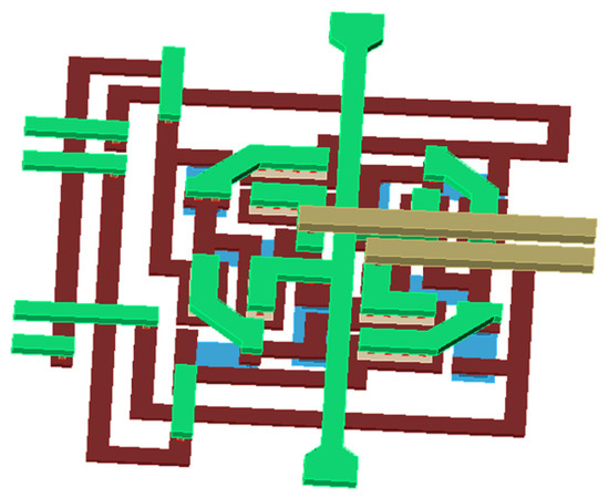 Figure 6 shows the layout of the proposed highly symmetrical miniaturized two-stage RC-CR polyphase filter. Compared with traditional quadrature signal generation modules, RC-CR networks have a small natural area and can expand the bandwidth through multi-stage cascade to realize broadband application. The second-order RC-CR network in this paper further reduces the layout area through highly symmetrical miniaturized layout and makes the length of each signal path equal as much as possible to reduce the amplitude and phase errors caused by the layout.