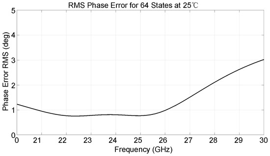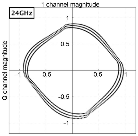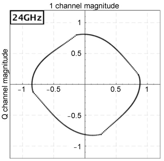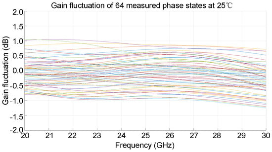 Figure 16 shows the phase shifting accuracy RMS value and gain fluctuation at room temperature (25 °C). Figure 17 presents the measured 64-QAM constellation diagram at room temperature. The active phase shifter designed in this paper achieves an RMS phase accuracy of less than 2° across the bandwidth range, with gain fluctuation ranging from −1.2 dB to 0.1 dB, demonstrating excellent phase shifting performance.
