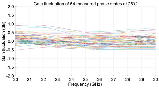 As analyzed earlier, in the ideal case, the 256 states form a perfect circle, which allows for optimal phase shifting accuracy and amplitude fluctuation performance. However, the relationship between current and gain is non-linear, which distorts the resulting circle and ultimately degrades both phase shifting accuracy and amplitude fluctuation performance. The simulated results for phase shifting gain fluctuation, obtained earlier, are shown in Figure 10. From the figure, it can be observed that the gain fluctuation is ±1 dB, indicating poor gain consistency.