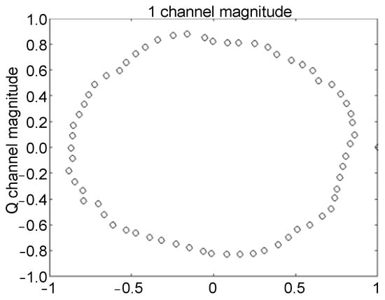 The output phase shift of the phase shifter is determined by the ratio of the tail currents II and IQ in in the Gilbert cells. To minimize amplitude fluctuations in the phase shift, it is essential to maintain a constant gain in the vector modulator. Thus, the sum of the tail currents for the two sets of Gilbert cells must remain constant. To improve phase shifting accuracy, a six-bit gate voltage control circuit is used to provide the gate voltage for the tail current transistors. The six-bit gate voltage is also produced by the on-chip SPI. It controls the quadrature signal synthesis of adjacent quadrants to obtain different phase offsets, and the multi-bit high-precision control voltage can make the phase precision of vector synthesis higher. The configuration allows for 64 distinct states in each quadrant, with two-bit control codewords used to manage the four quadrant states. In total, 256 distinct phase states are achievable, with ideal conditions ensuring that the state points are evenly distributed on a circle. The final 64 states for phase shifting are selected from these 256 states. Electromagnetic simulations of the phase shifter were performed, and after scanning all states, the best 64 states were selected using simulation software (Advanced Design System 2019). The resulting constellation diagram and the RMS phase error for the phase shifter are shown in Figure 8 and Figure 9, respectively.