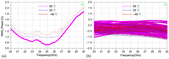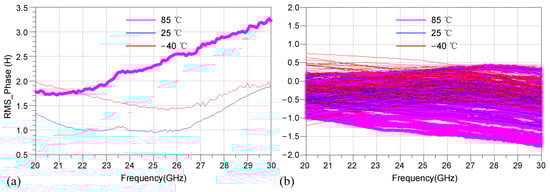 To evaluate the three-temperature performance of the active phase shifter, tests were conducted on the same chip, using the same phase control codes, at −40 °C, 25 °C, and 85 °C. Figure 18 shows the phase accuracy RMS values and gain fluctuations at the three temperatures, where red represents low temperature, blue represents room temperature, and pink represents high temperature. The test results indicate that, at both room temperature and low temperature, the RMS phase error remains below 2° across the frequency band, while at high temperature, the maximum phase error is slightly worse at 3.3°. The gain fluctuation across the three temperatures ranges from −1.7 dB to 0.7 dB.