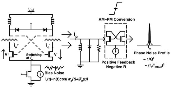 In addition to the noise generated by the circuits, noise from the power supply also affects phase noise [,,]. Using the transistor as the tail current source can decrease the noise from the power supply to the VCO. For PMOS-only VCO, the active region provides the VCO with better protection against noise from the power supply []. The mechanism of phase noise generation through bias noise conversion is illustrated in Figure 1.