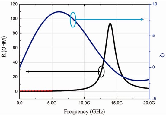 Simulated impedance and quality factor versus frequency characteristics in the LC tank. R and Q are plotted with respect to frequency in GHz.