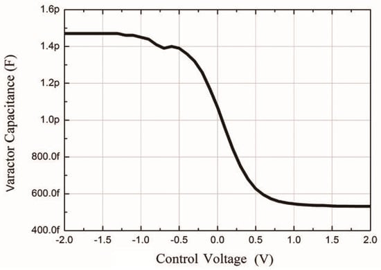 The cross-coupled pair is used to suppress parasitic effects introduced by the transistors. It can increase the ratio of tuning capacitance (Cv) and parasitic capacitance (Cparasitic). A high Cv/Cparasitic ratio can achieve a wider frequency tuning range. The PMOS varactor Cv value at different control voltages is shown in Figure 3. Figure 3 shows a good Cmax/Cmin ratio of about 2.78, which can be achieved when using 0.18 µm bulk CMOS technology with a tuning voltage ±2 V.
