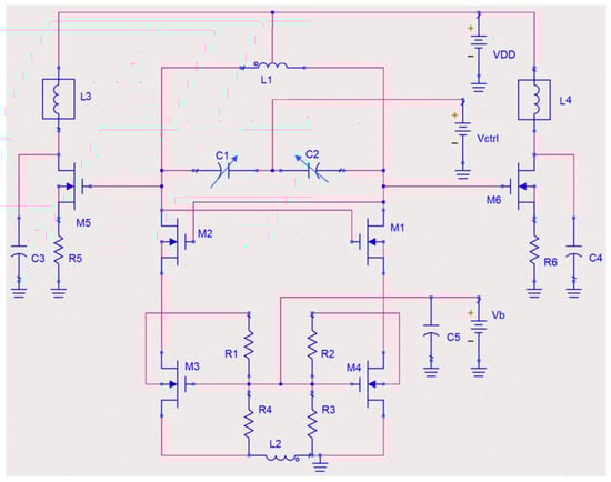 Schematic of the proposed CMOS voltage-controlled oscillator (VCO). This diagram illustrates the complete circuit topology, including the cross-coupled NMOS pair, varactors, biasing network, and buffer stages. Passive component values (L, C, R) are process-optimized and discussed in Section 3.1.