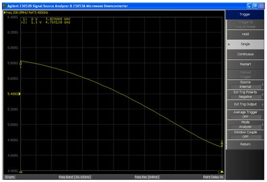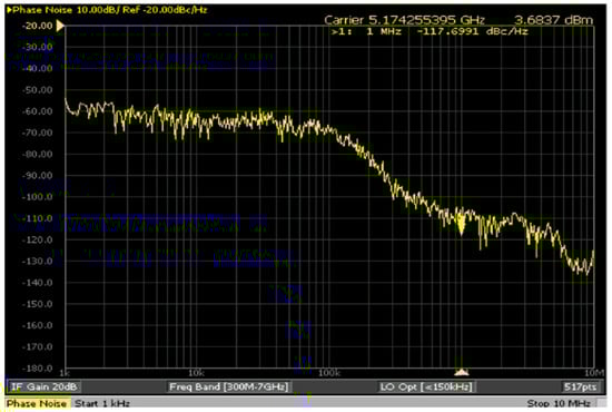 Output frequency and output power were measured using a Keysight E5052B signal source analyzer (Keysight Technologies, Santa Rosa, CA, USA). Phase noise measurements were conducted with a Keysight E5052B signal source analyzer in combination with an E5053A microwave downconverter (Keysight Technologies, Santa Rosa, CA, USA). Figure 11 illustrates both measurement setups and their corresponding equipment configurations. No external bandpass or harmonic filtering was applied during the output measurement; the results represent the direct output spectrum of the VCO.