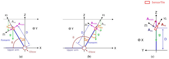 During the experiments proposed here, the SensorTile inertial device is fixed to the forearm at a distance D from the elbow. It is equally fixed to the coordinate system formed by the X1, Y1, and Z1 axes. For these conditions and assuming that the part of the Z1 coordinate of the sensor acceleration related to motion is negligible compared to that due to gravity (with a stationary sensor or one subjected to a slow enough movement), the estimate of the elbow joint angle from the accelerometer data is given by