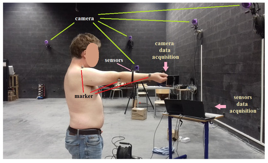 Acquisition of movement of the human arm using an infrared camera system, the required optical markers, and the tested inertial device.