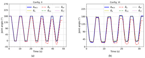 Examples of estimated elbow–joint angles: (a) configuration II (robotic arm); (b) configuration VI (human arm).