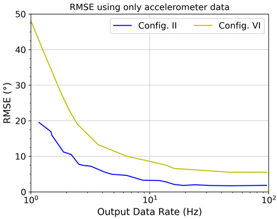 The RMSE obtained for configurations II and VI with the algorithm using only accelerometer data versus the sensor’s output data rate.
