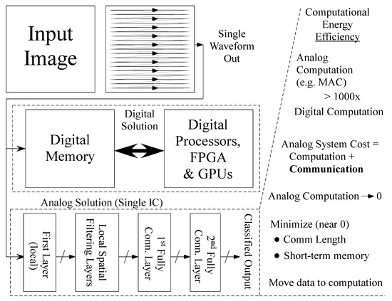 Image processing and image convolutions require significant analog architecture efforts to rearrange data trajectories for image convolutions (Figure 1) when the output of a typical commercial sensor scans each output in a serial stream, one row at a time. Digital approaches deposit the incoming image into a large memory bank due to the ease of downloading an image to memory. Digital computation is far more energetically expensive than analog computation, obscuring the need for minimizing the cost of communication and memory. The 1000×-improved analog computational energy efficiency means that computation is nearly free, where communication and memory access costs make up the system architecture cost. The costs of data communication and memory are always the primary system architecture concerns, moving away from the typical large-processor model in digital architectures [2]. Energy-efficient computational systems require energy-efficient computation with minimized signal communication and short-term memory.