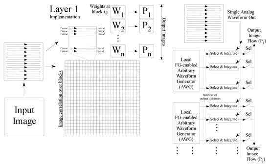As an input image comes from a serial scan of a CMOS imager, the resulting computation requires moving the computational elements of the input weights and the resulting multiplication to match the incoming data to minimize the amount of stored intermediate data. Certain weight coefficients would appear in the correlation with a subregion of an image. This effectively requires supplying multiple programmable input waveforms with multiple pauses at just the right times. Controlling an FG-enabled Arbitrary Waveform Generator (AWB) in a bank of integrating elements (also short-term memory elements) computes the transform over a row of blocks. Selecting these outputs at the right time creates matrices (P1, P2) in the same scanned form as the incoming image, allowing the same structure to be used over multiple convolutional layers. If the input scanned image is a 3-color image, one would have three copies of these transformations, as seen in the next layers.