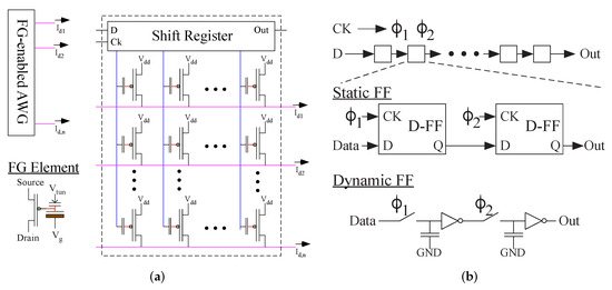 A Floating-Gate (FG)-enabled Arbitrary Waveform Generator (AWG) enabling n parallel output signals. (a) An FG AWG with a vector of available current outputs. (b) A shift register block controls the AWG using a clock-controllable, shift register data input that is auto-regenerating in a loop (always a single one in the register at a time), with an 1 output when the signal has passed through the entire shift register. The shift register block uses either static or dynamic logic.