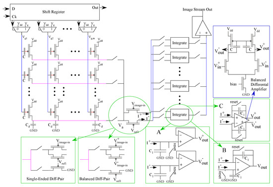Detailed circuit development for the single-image-flow computing algorithm. The modeling of the shift register follows a nearly ideal clocked digital system given the short interconnects (capacitances), and the gate line drivers tend to be near digital speeds, converging to the global gate line (Vg), which goes to an FG bootstrap current source to minimize temperature fluctuations. The multiplexor block is designed to drive the FG input capacitors; the small capacitances allow near-minimum-size devices. The AWG selection switches include a current shunt to GND, so a current is always flowing through the node to reduce additional state variables. The input voltage Va into either the single-ended or balanced-ended differential pair is effectively a first-order low-pass equation. The differential output current is then directed into one of multiple single or differential current integrators, with the output signal buffered to the next computation layer. The amplifiers use two integrating capacitors (C1) with corresponding reset switches. Amplifier B enables single-ended signaling, and A and C enable balanced differential-pair signaling.