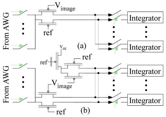 The core system correlates the input signal with the desired weight value encoded as a waveform (AWG block), first pixel by pixel and then on a slower timescale, row by row. Although the AWG block and resulting outputs are straightforward, the remaining computation requires some consideration. The weights are reused for each subblock of the original image, effectively repeating the played correlating waveform of the weights (Figure 4). The AWG waveform output current goes through a source-coupled transistor pair (Figure 7), enabling the modulation of the scanned input image signal. Clocking schemes (Figure 7) should be as local as possible to minimize communication and minimize clocking complexity. The shift registers can be dynamic shift registers, as the signals are always moving during computation, significantly reducing the circuit complexity. The “pause” and “Sel” are line-dependent clock-switching operations that roll the data in the right direction. The output of these integrator elements can be followed by a Sigmoid, Relu, or other nonlinear function (WTA, max pool) (e.g., [62]).