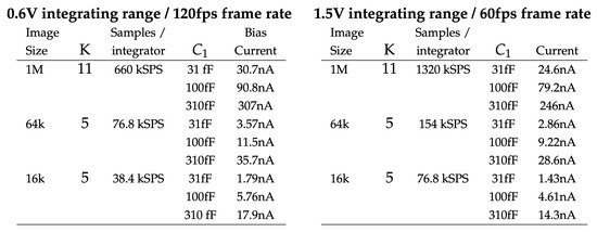 These integration windows set the required bias currents, and that sets the average current level for the AWG block. The bias current (Ibias) is a function (Figure 10) of the imager size, frame rate, and receptive field overlap (K × K). The required currents will be subthreshold currents (less than 1 μA), simplifying the FG programming of these elements and allowing the FG measurements to focus on this narrower range of computation [13].