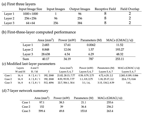 Architecture tradeoffs for a 7-layer ConvNN with significant receptive fields for each layer using 28nm CMOS standard cells. For these and other 28nm computations, = 5fF, = 0.5fF, = 50fF, . (a) Parameters for the first three layers. (b) First-three-layer computed performance (area, power, computations, and parameters). (c) Modified last-layer parameters. (d) Seven-layer network summary.