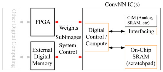 This single-chip FG-enabled ConvNN architecture (Figure 3 and Figure 4) on a 28nm or smaller CMOS IC benefits from a stable analog circuit capability that, once programmed, will operate with minimal change over the entire IC lifetime. The architecture is based on image-processing algorithms initially developed for FPAA devices and generalized for any analog structure [2,58]. This application is an excellent analog architecture development example (Figure 3), as the primary issue is the architecture and not analog numerics [59], as image convolution applications (e.g., visual attention [27,30], ConvNN [50]) are known to not require significant precision for their calculations, even with a time-sampled algorithm, and therefore, these classes of problems are part of the analog benchmark formulation [60]. Many problems already consider analog numerics (e.g., linear equation solutions [61]).