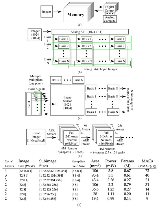 This article presents the first important example of an analog system that requires considerable analog architecture for image classification (Figure 1), transforming a typical imager input into a classified result using a particular NN algorithm (Figure 3), a convolutional NN (ConvNN). The roots of these algorithms come from the modeling of visual attention [20,21,22,23,24,25,26,27,28,29,30,31,32,33], Hubel and Weisel’s early primate visual cortex measurements and modeling [34,35,36,37,38,39,40,41,42,43,44,45], and the resulting work on the development of spatial receptive fields [46,47,48]. These pyramid structures are similar to the local image correlations developed in visual attention algorithms [27,30]. Often, the first layers of a ConvNN are similar to the adapted solutions (e.g., Principal Component Analysis (PCA) [48]) for the LGN, V1, V2, and next levels in the visual cortex. This creates a number of subsampled image features through local convolutions with the same filter weights. The parameters are small and are not directly dependent on the image size. An image convolution might be for line orientation, edge enhancement, and higher-level features. It is common to see discussions of the receptive fields for the first layer, similar to earlier developments looking at the formation of input receptive fields (e.g., [46,47,48]). Successive subsampling of the structure enables some wider form of position invariance for different image blocks. The ConvNN [49,50,51] has shown significant capabilities over a range of datasets (e.g., CiFAR10 [52], BDD100k [53,54,55]).