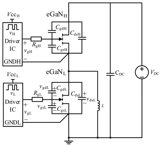To facilitate the analysis of the crosstalk problem formation in eGaN HEMT power devices [22], a simplified equivalent half-bridge circuit is used as an example, as shown in Figure 1. According to Kirchhoff’s formula: