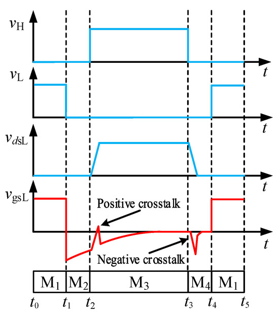 where RgL = R3 + R4, CissL = CgsL + CgdL. From Equation (8), vgsL is positively correlated with t; when t→VDC/a, vgsL reaches its maximum value. Currently, it is necessary to meet the condition that the positive crosstalk voltage peak is less than the threshold voltage of the device.