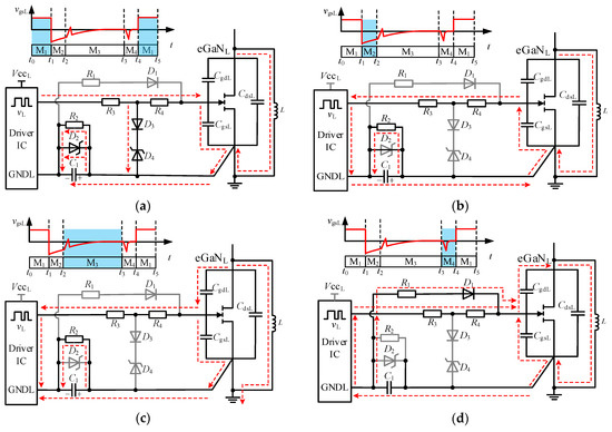 Gate driver modal diagram. (a) M1: turn-on phase; (b) M2: transition phase; (c) M3: positive crosstalk suppression phase; and (d) M4: negative crosstalk suppression phase.
