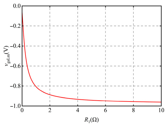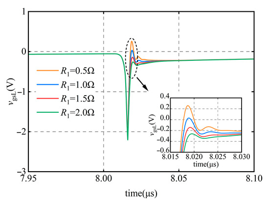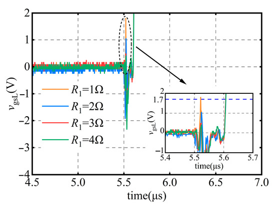 Figure 7 shows the correlation between resistor R1 and the peak negative crosstalk voltage vgsLm, from which it can be obtained that the value of vgsLm is positively correlated with R1. Therefore, the smaller the resistance value of R1, the better. At the same time, as R1 decreases, the impedance of the gate driver decreases, increasing the device gate-source oscillation. This results in the positive oscillation being too large and exceeding the device threshold voltage, thereby increasing the risk of device misconduct. The relationship between the device gate-source oscillation and R1 is shown in Figure 8. Therefore, both factors must be considered when selecting the value of R1.