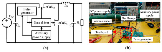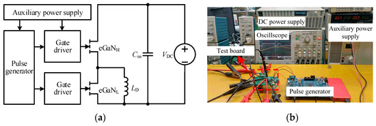 The setup of the double-pulse test platform is shown in Figure 9a, where eGaNH is an active tube and eGaNL is a passive tube; VDC is the input power supply, which is 50 V; Cin is the DC link capacitor, which is 330 μF; LD is the load inductance, which is 50 μH.