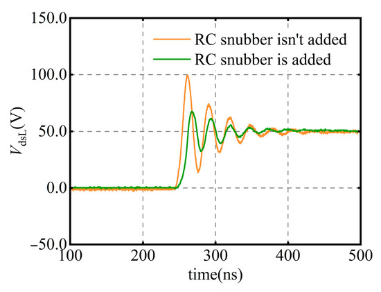 During the switching process of the device, due to the interaction between the parasitic inductance and capacitance of the circuit, overshoot and ringing phenomena occur in the drain-source voltage of the device, increasing the risk of drain-source breakdown and thereby affecting the circuit’s safety. In this paper, the method of connecting an RC snubber in parallel with the drain and source of the device is adopted to reduce the ringing. The drain-source waveforms before and after adding the RC snubber are shown in Figure 10. From the results, it is evident that the maximum value of the ring is reduced by 33 V.