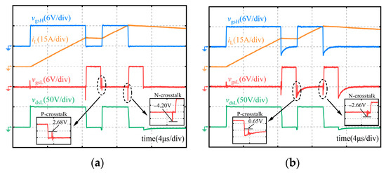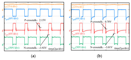 The synchronous Buck test results are shown in Figure 16. The positive crosstalk peak value of the proposed gate driver is reduced by 1.37 V compared to the conventional gate driver, and the negative crosstalk peak value is decreased by 0.91 V. Crosstalk suppression capability is more evident in double-pulse tests than in synchronous Buck circuits. However, the result demonstrates that the proposed gate driver presents a positive crosstalk peak value of less than 1.7 V and a negative crosstalk voltage peak value of more than −10 V under both test conditions, which meets the safe operation requirements.
