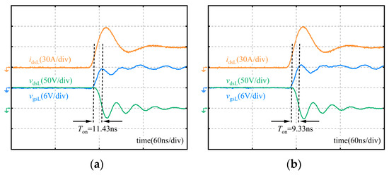To investigate the effect of the proposed gate driver on the switching performance of the device under test, the switching waveforms of the device are compared under both the conventional gate driver and the proposed gate driver. The turn-on waveforms of the device under these two circuits are shown in Figure 13, from which it can be observed that the turn-on time of the device under the traditional gate driver is 11.43 ns, and the turn-on time under the proposed gate driver is 9.33 ns.
