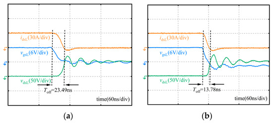 The turn-off waveforms of the device tested under these two gate drivers are shown in Figure 14, from which it can be seen that the turn-off time is 23.49 ns under the conventional gate driver and 13.78 ns under the proposed one. Under the proposed gate driver’s operation, the device’s turn-off speed is enhanced by approximately 41.34% compared to the conventional driver, as C1 enables negative-voltage turn-off of the device.