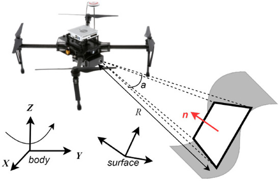 The sensor’s field of view (FOV) is modeled following the formulation established in our previous work, as illustrated in Figure 3, and the same definition is adopted herein. The sensing footprint is approximated as a square region with side length defined by , where denotes the sensor range and represents the FOV angle. This approximation determines the mesh resolution of the projection plane, upon which a discrete set of sampling nodes is selected across the surface.