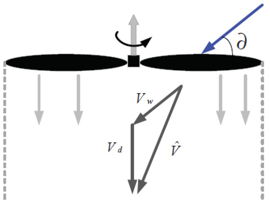 However, UAVs will unavoidably be affected by wind disturbance in a real environment, which can cause them to experience extra force. As shown in Figure 4, this wind force not only increases the drag on the UAV’s body, but also alters the induced airflow velocity underneath the rotor blades. Consequently, the lift would also differ. Considering that the UAV’s body has a relatively small cross-sectional area, only the effects of wind force on the rotor blades will be taken into account.