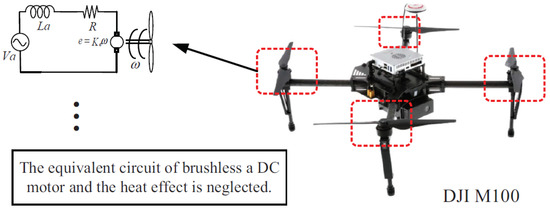 As brushless DC motors have the advantages of large efficiency area, high power and torque density, they have been widely used in UAVs. The equivalent circuit diagram of a brushless DC motor is shown in Figure 6 (for simplicity’s sake, the power loss of a DC motor caused by heat effect is not considered):
