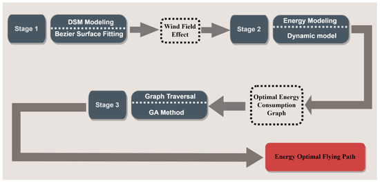 To ensure computational feasibility, the framework adopts a modular, three-stage structure. The most computationally demanding components—such as energy consumption modeling and global path optimization using genetic algorithms—are performed offline. Once the energy-optimal path is generated, it can be uploaded to an onboard flight controller, which executes the trajectory in real time with only light adjustments. This separation allows the system to operate on conventional UAV hardware with limited onboard computing capacity.